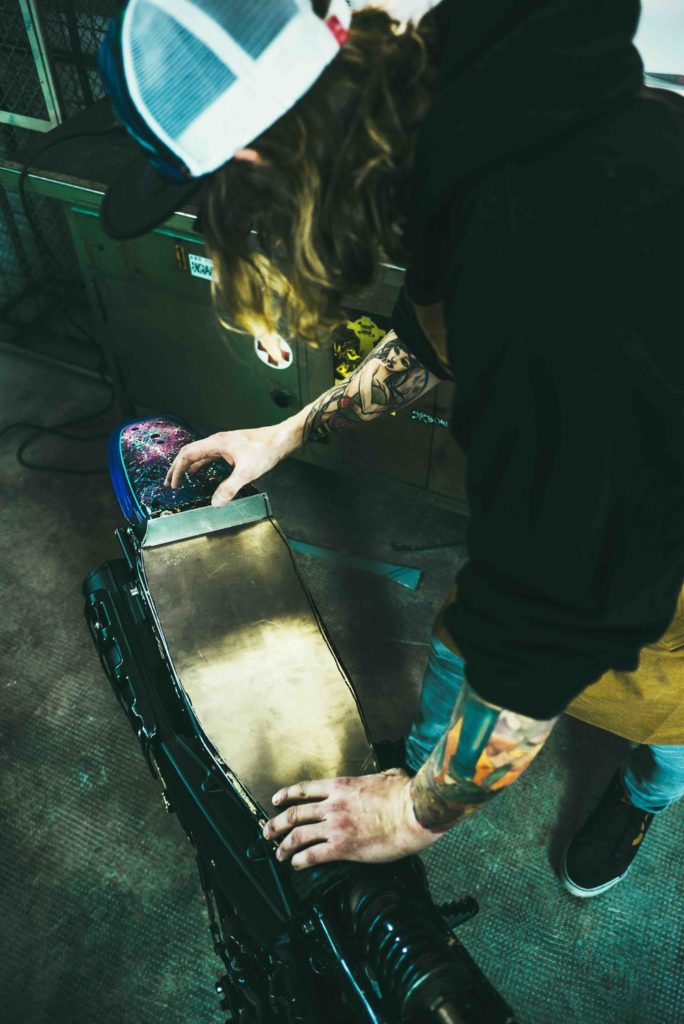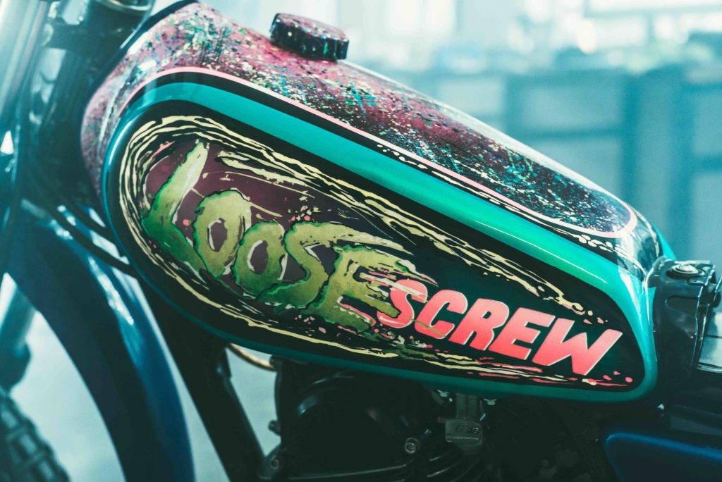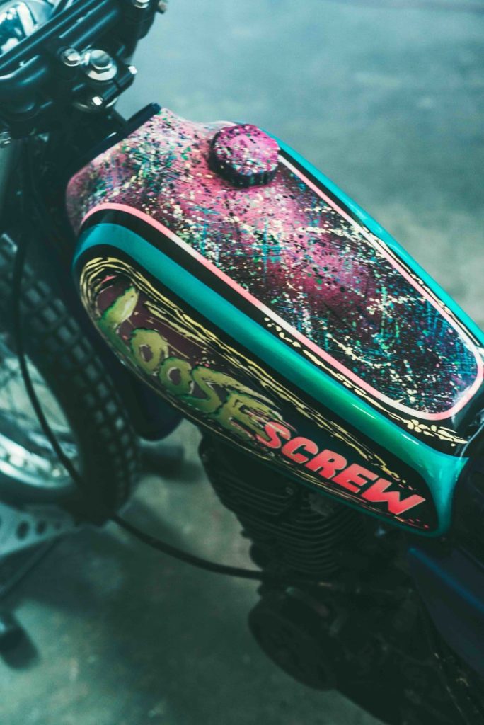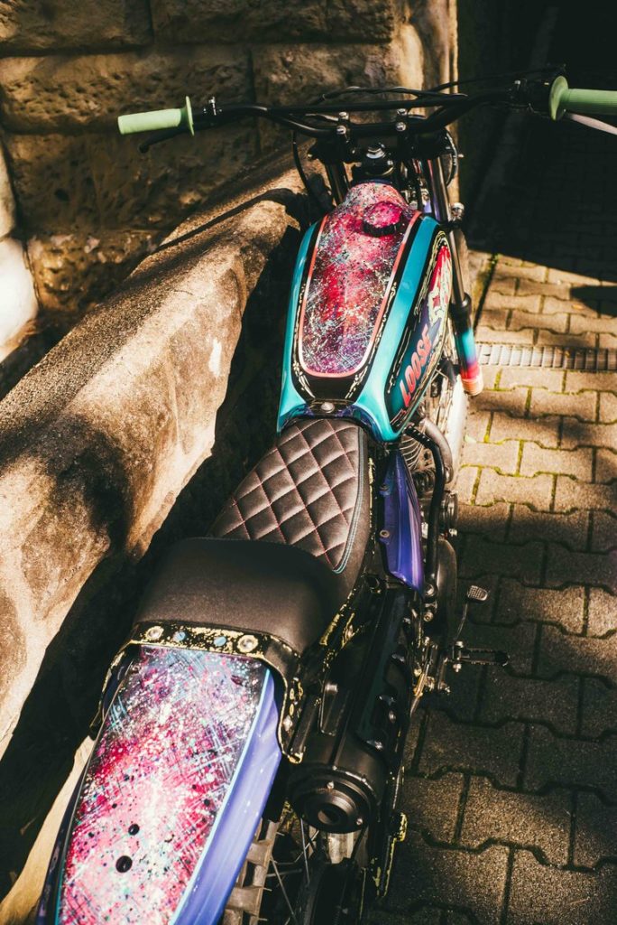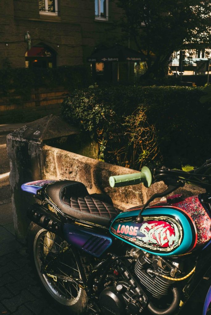 Nachdem alles beisammen war, musste noch eine Sitzbank her. Das i-Tüpfelchen auf dem 80’s Trash Bike. Feinstens angefertigt von SAM in München. Als zweites i-Tüpfelchen gab es einen gravierten Öl Deckel von Carsten Estermann. Und so steht sie nun da. Schaut mit ihren grellen Farben aus dem glubschigen PIAA Scheinwerfer und wartet für den TÜV fertiggemacht zu werden.